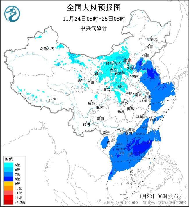 中央气象台11月23日06时继续发布大风蓝色预警: